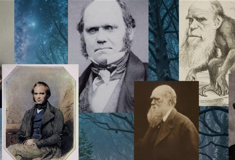 画像出典:Wikimedia Commons – Charles Darwin 1816.jpg、Charles Darwin by G. Richmond.jpg、Charles Darwin.jpg、Editorial cartoon depicting Charles Darwin as an ape (1871).jpg (パブリックド
