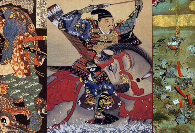 画像出典:Wikimedia Commons – Miyamoto Musashi killing a giant nue.jpg、Sengoku period battle.jpg、NasunoYoichi.jpg